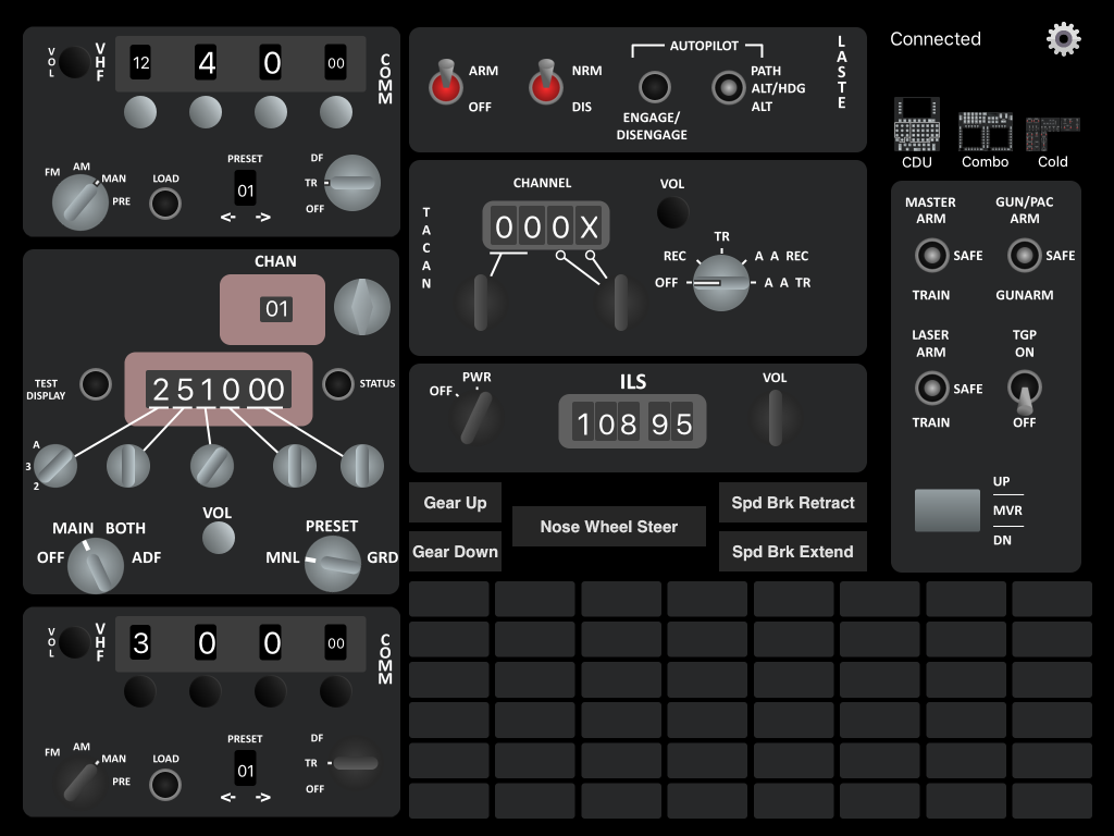 All buttons, switches, and dials in iControl DCS are fully interactive. In both directions! Flip a switch on the iPad, the switch flips in-sim. Flip a switch in-sim, the switch will be instantly updated on the device to match!